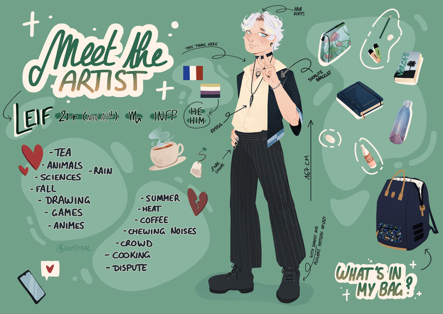 ㅤㅤHi ! I'm Leif c:I'm a french dude currently working as a part-time scientific mediator. Outside my working hours, I like playing games, drawing and writing. I even started to stream as a PNGTuber for my friends but don't hesitate to join us if you're interested ! I mostly play Identity V and Genshin but I like trying new things !